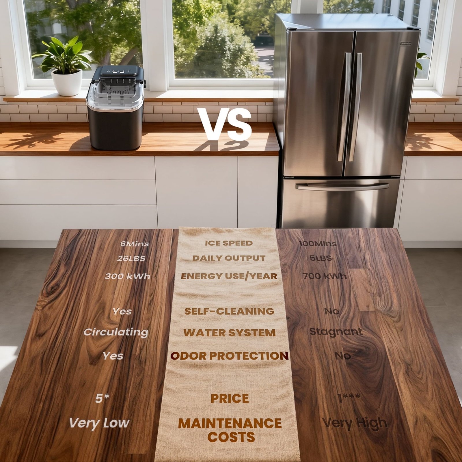 This Ice machine produces 6 bullet-shaped ice cubes in just 8 minutes with a daily capacity of 26 lbs. The integrated 0.8L water tank ensures a continuous ice supply, making this small ice maker perfect for any setting.