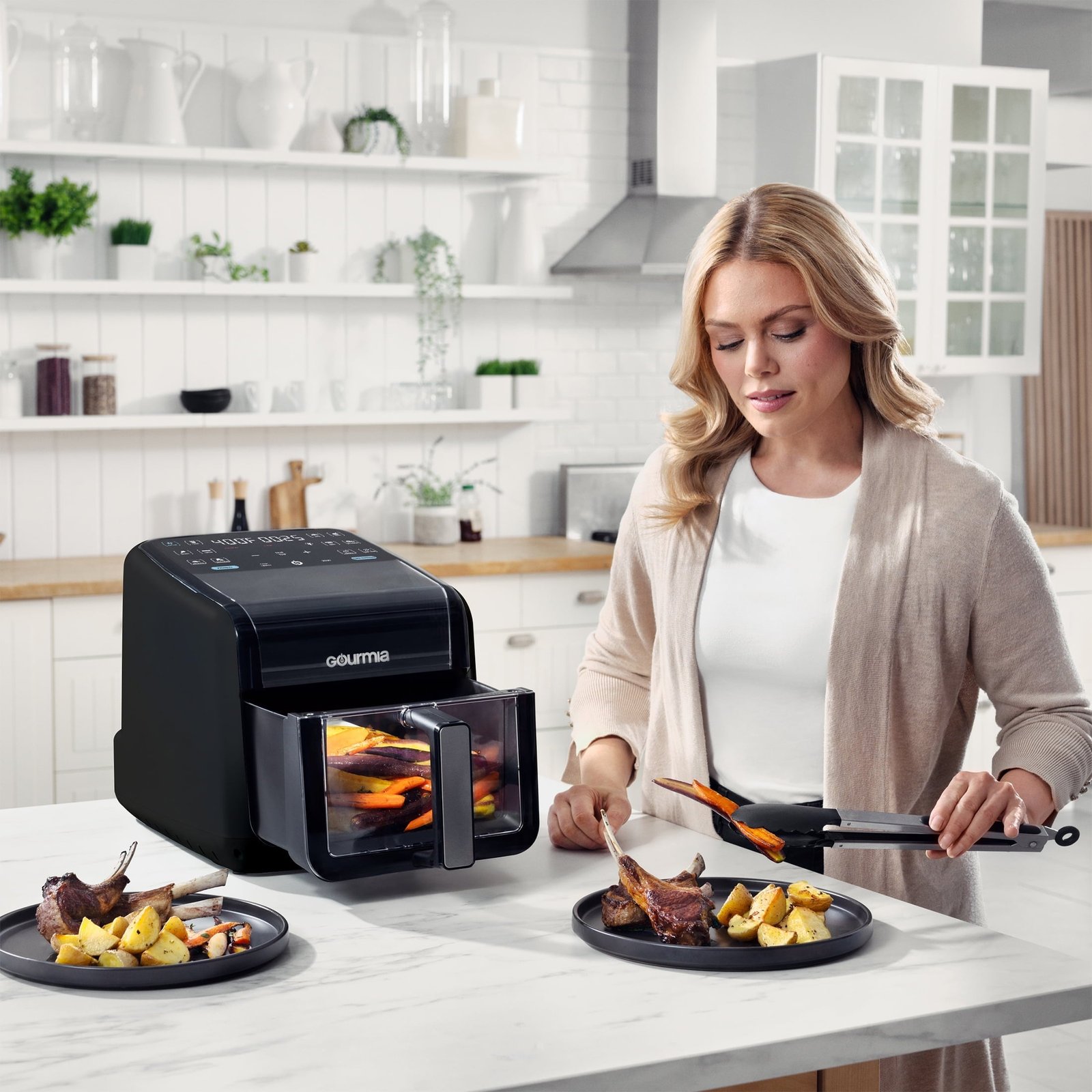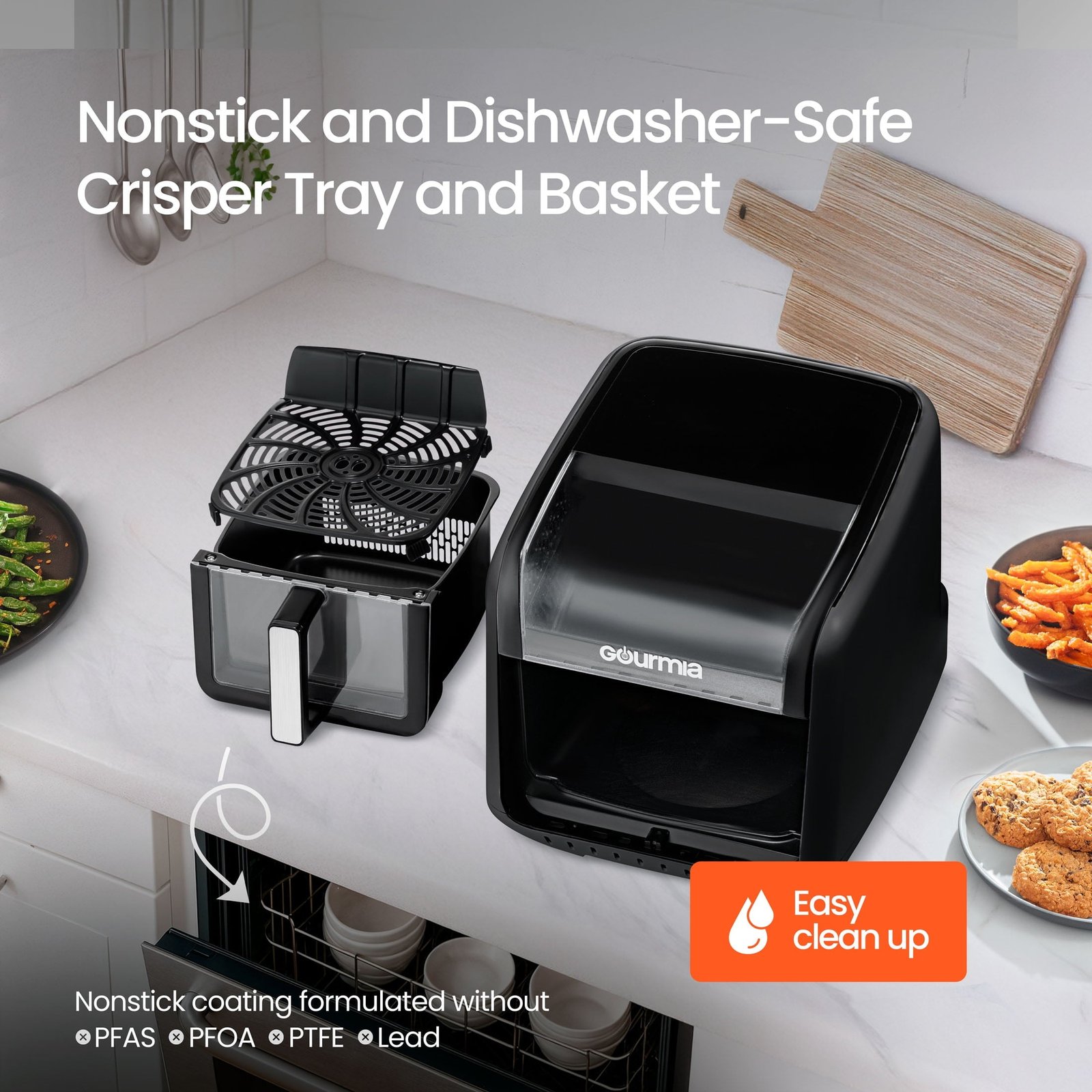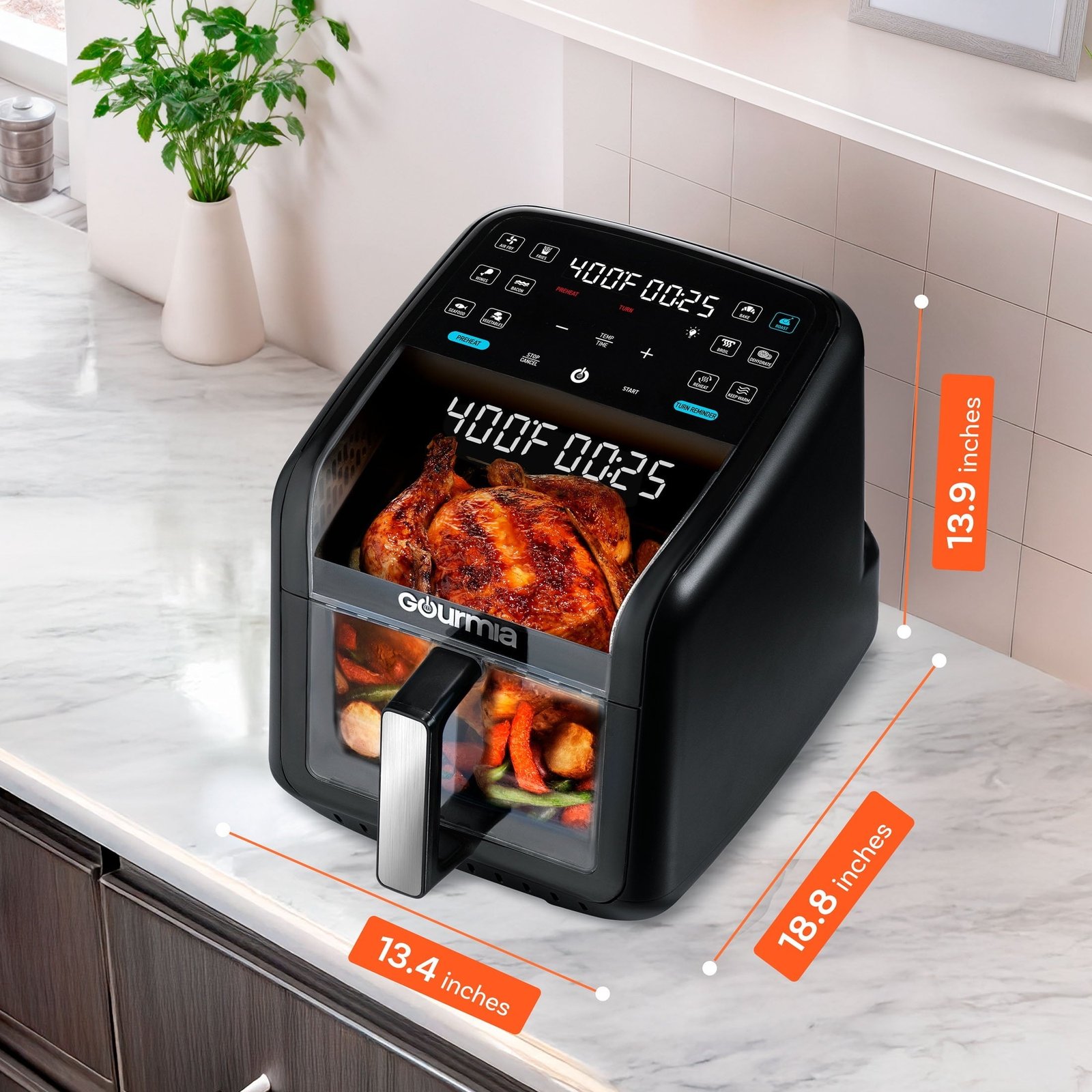The Gourmia 7-QT. Panorama Digital Air Fryer was engineered for effortless cooking. Cook with a tap of 12 One-Touch Cooking Presets. Let FryForce 360° Technology™ heat your food to a crispy finish in no time. The large, curved window offers a full view of food to easily monitor cooking, while the 3D holographic display projects temp, time, and display messages. An optional preheat and turn food reminder offers ultimate convenience, and Guided Cooking Prompts walk you through the cooking process with helpful display messages and alerts. Turn cleanup from messy to easy with a nonstick dishwasher-safe basket and crisper tray. 1500 Watts.