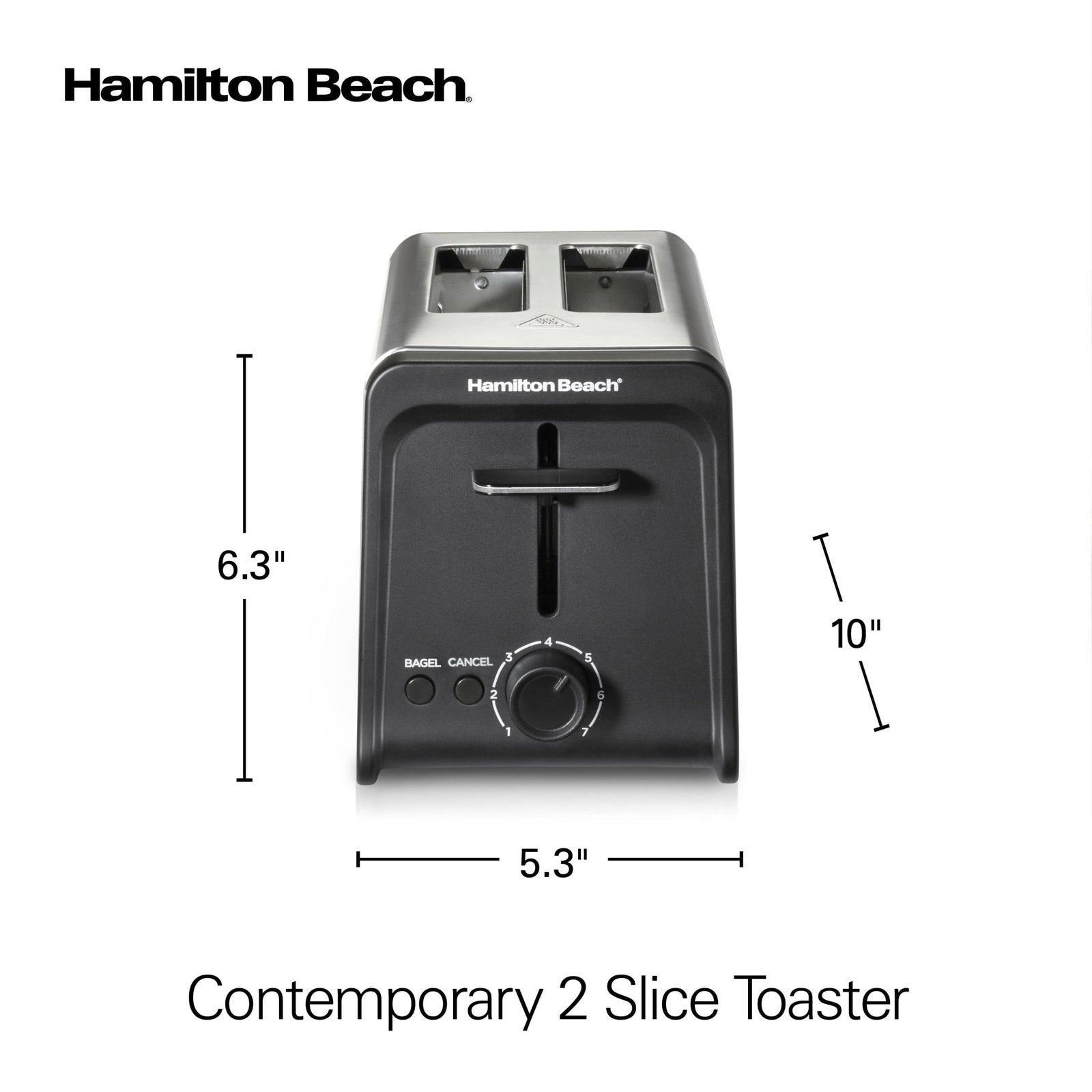 Toast isn’t just for breakfast anymore! The Hamilton Beach® Contemporary 2 Slice Toaster has 2 wide slots to easily toast a variety of breads. The wide slots fit bagels, artisan and homemade bread slices. You’ll make perfect toast every time to enjoy for breakfast, lunch or dinner. The modern, stainless steel design not only looks great in the kitchen but will fit small spaces. Enjoy your toast just the way you like it. Simply turn the shade selector to make lighter or darker toast. The bagel button extends the toasting time so bagels turn out warm and delicious every time.