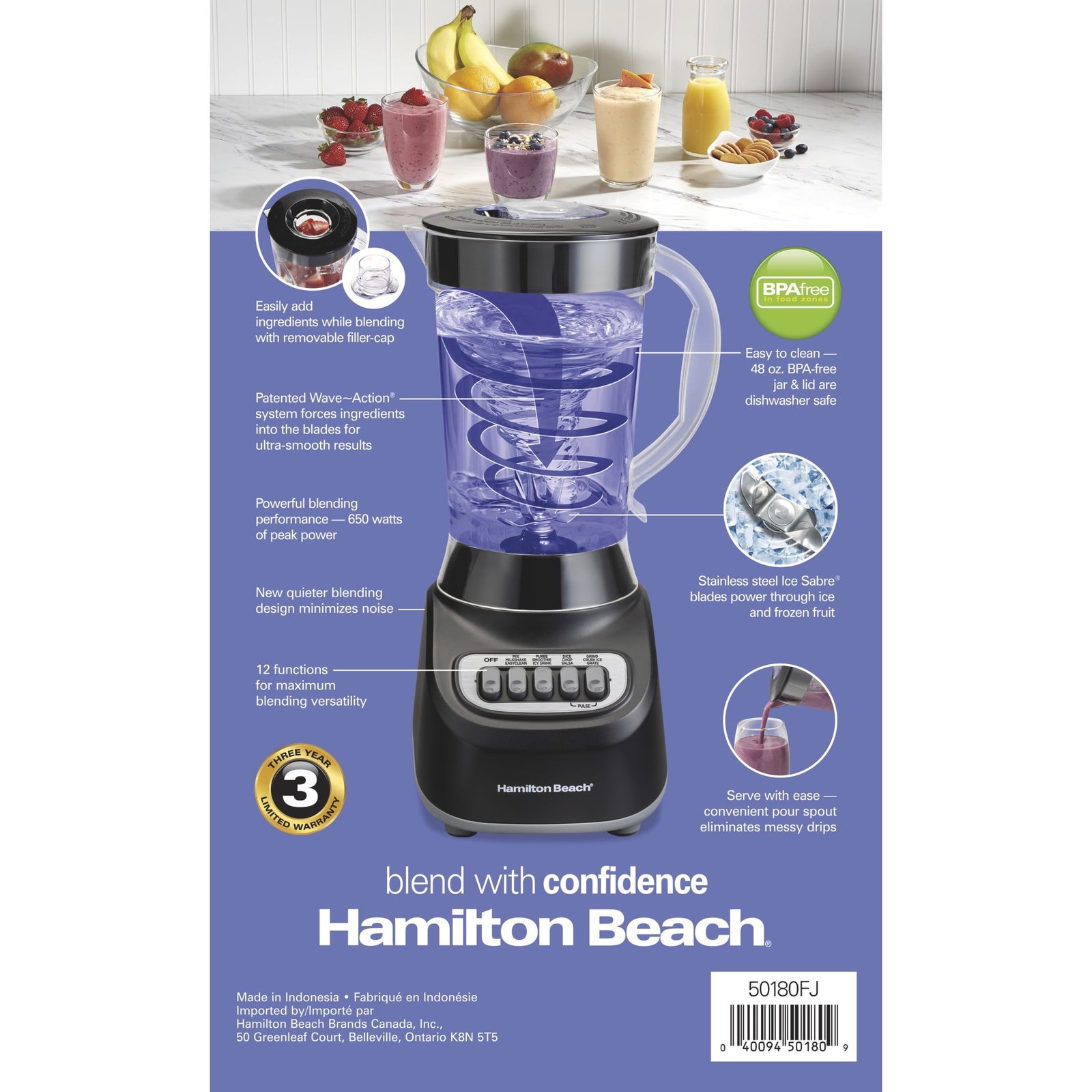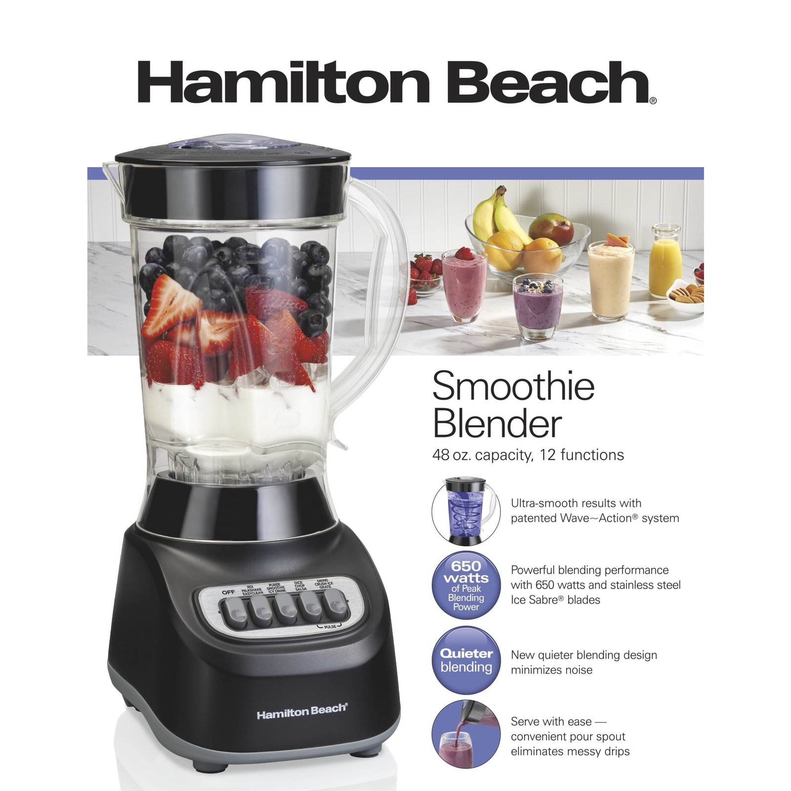 The Hamilton Beach® Smoothie Blender is built for powerful performance and ultra-smooth results. Featuring a patented Wave~Action® system, this blender continuously pulls ingredients down into the stainless steel Ice Sabre® blades to crush even the toughest foods like ice and frozen fruit. With 650 watts of peak power, 12 blending functions, and a quieter blending design, it’s perfect for smoothies, shakes, and frozen drinks. The 48 oz. BPA-free jar includes a convenient pour spout and removable filler cap for mess-free serving and easy ingredient additions. Backed by a 3-year limited warranty, it’s made for long-lasting use.