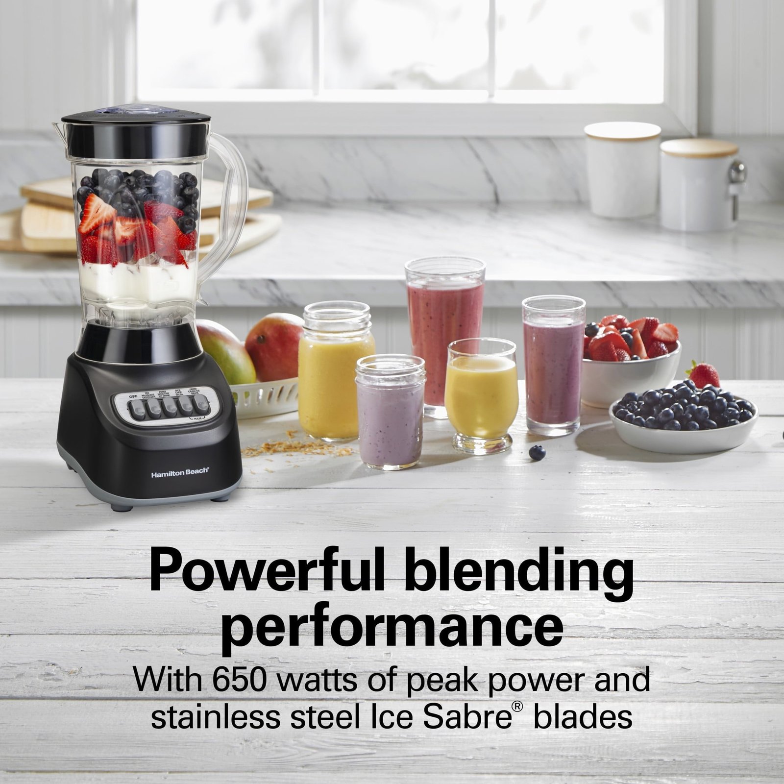 • 650 Watts of Peak Blending Power: Crushes ice and blends frozen fruit with ease.