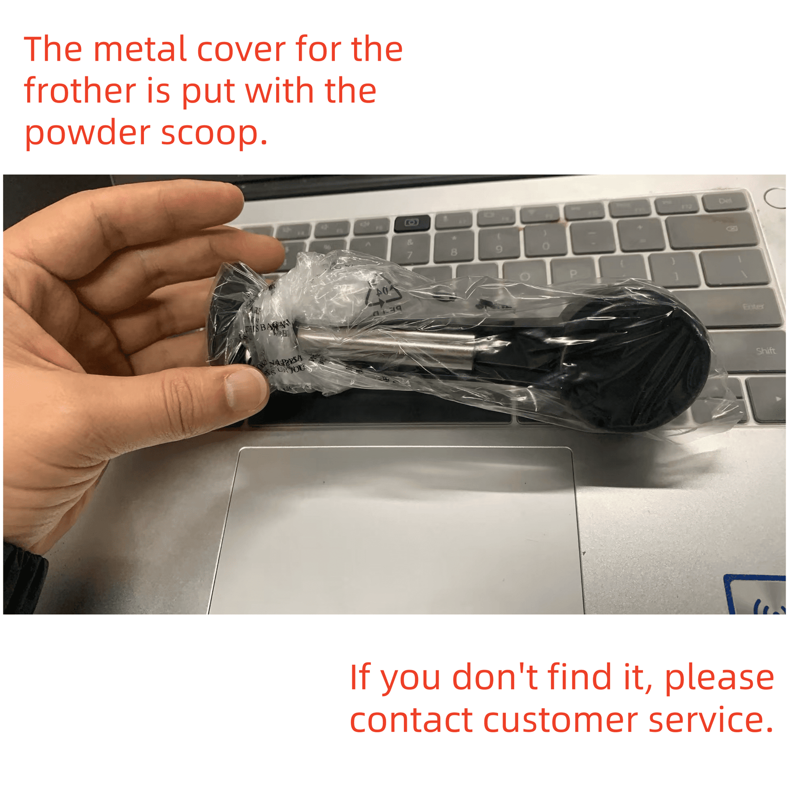 - The milk frother’s metal cover is stored with the measuring scoop.