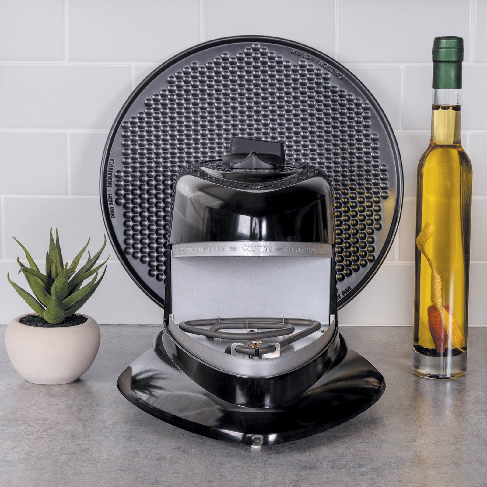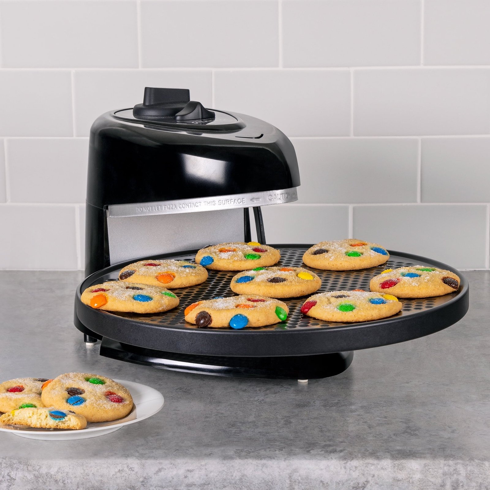 The Presto Pizzazz Plus rotating pizza oven, 03432 Black truly bakes a perfect fresh or frozen pizza. With top and bottom heating elements, it cooks from both sides for fast, uniform cooking. Bake and brown quesadillas, chicken wings, pizza rolls, jalapeño poppers, egg rolls, and other convenience foods without heating up your conventional oven. Pizzazz® Plus starts cooking immediately with no preheat necessary. Features a nonstick baking pan. With separately controlled heating elements you can select top, bottom, or both elements for the results you want every time. The timer will signal the end of cooking time and automatically turn off the heating elements. 13.31” W x 18.00” D x 9.02” H, weight 5.82