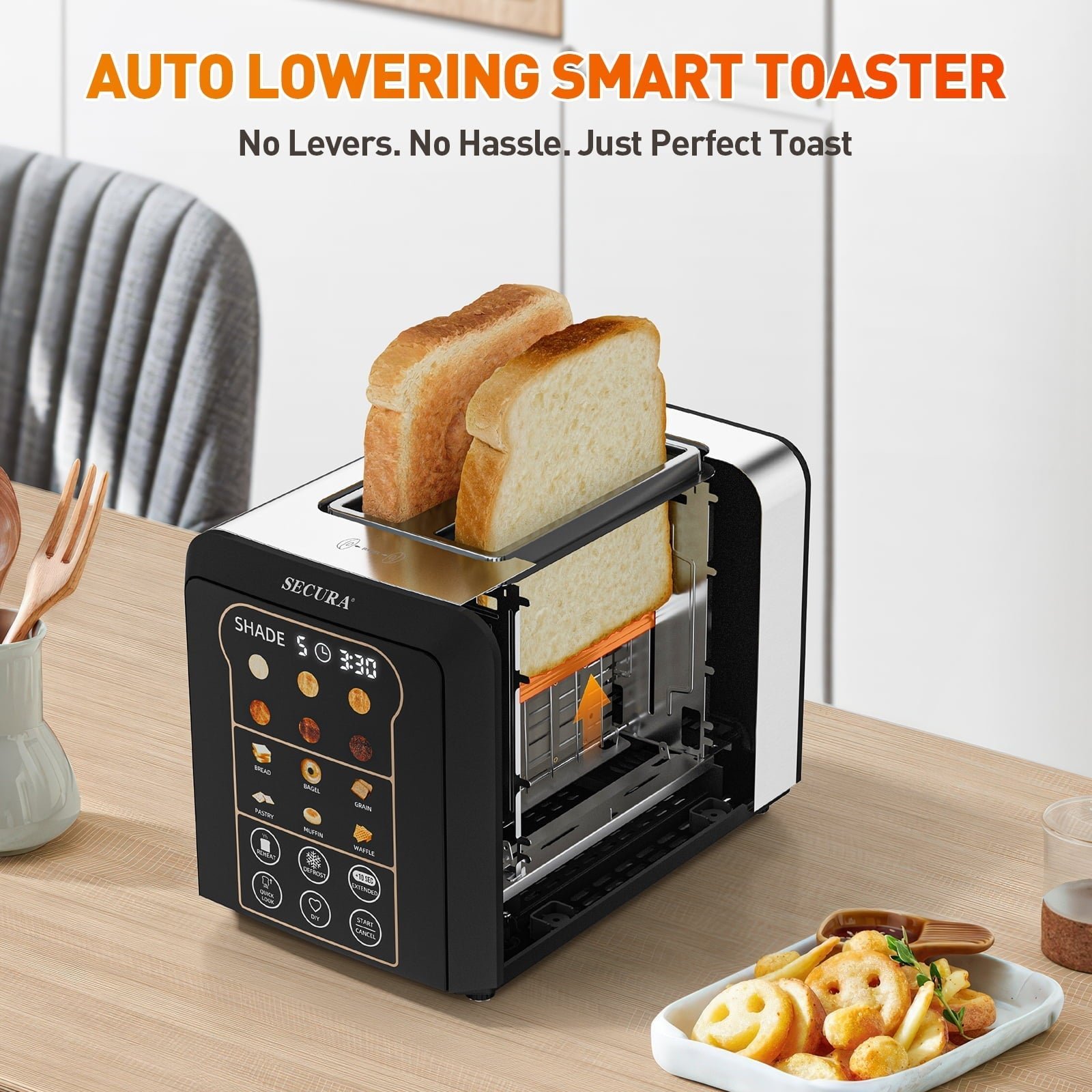 Secura Toaster 2 Slice Smart Toaster with Auto Lift&Lowering Touch Screen, Digital Countdown, Wide Slots for Toasting Bagels Breads Waffles & More 6 Browning Levels Customizable Settings